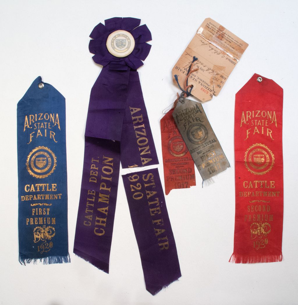 Almost 100 years ago, a rancher displayed his prized possessions at the Arizona State Fair. There are first and second small agricultural department premium ribbons from 1917 (for white oat seeds exhibited by A. C. Plake with an address of Puma Indians) and large first and second premium cattle department ribbons for 1920. There is also a large Arizona State Fair Cattle Department Champion ribbon. This ribbon has folds and one strand is in two pieces. Still the history....