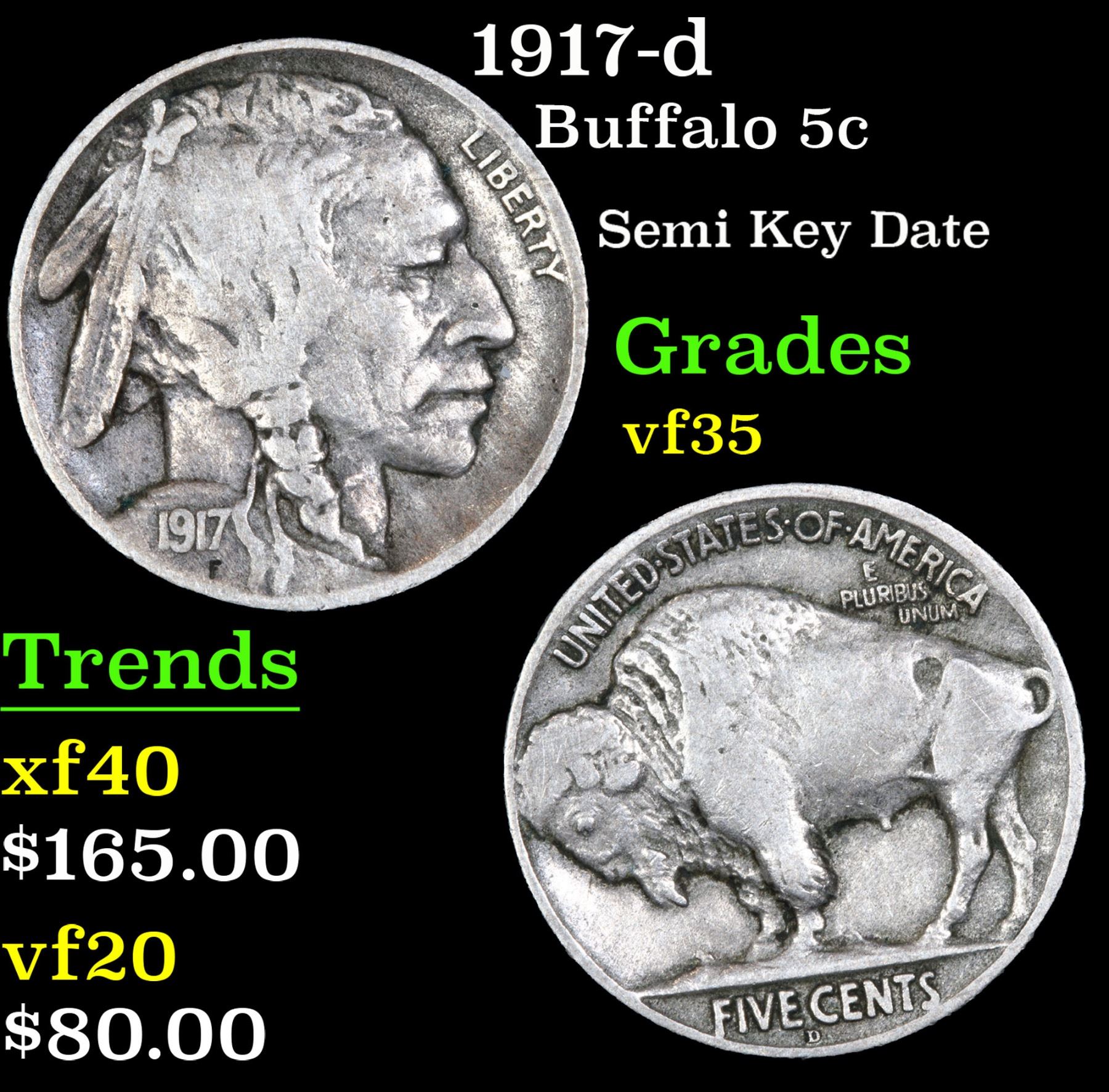 1917-d Semi Key Date . Buffalo Nickel 5c Grades vf++.