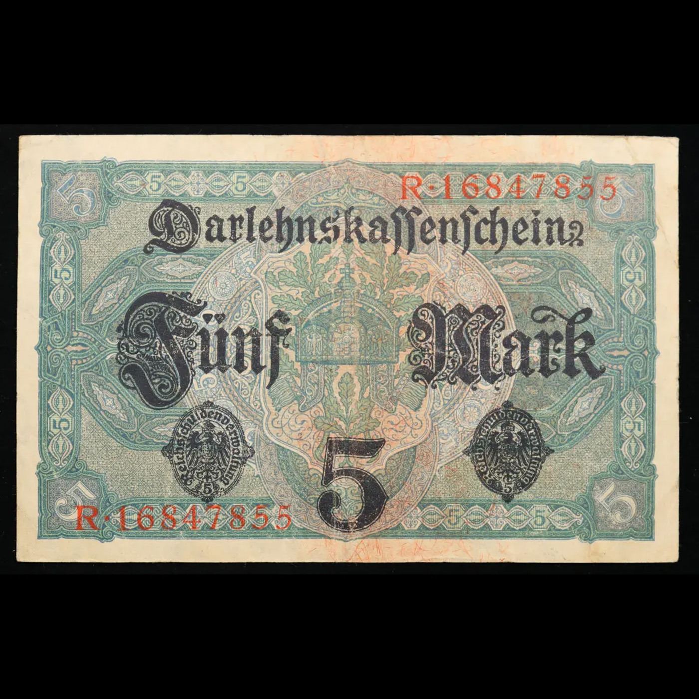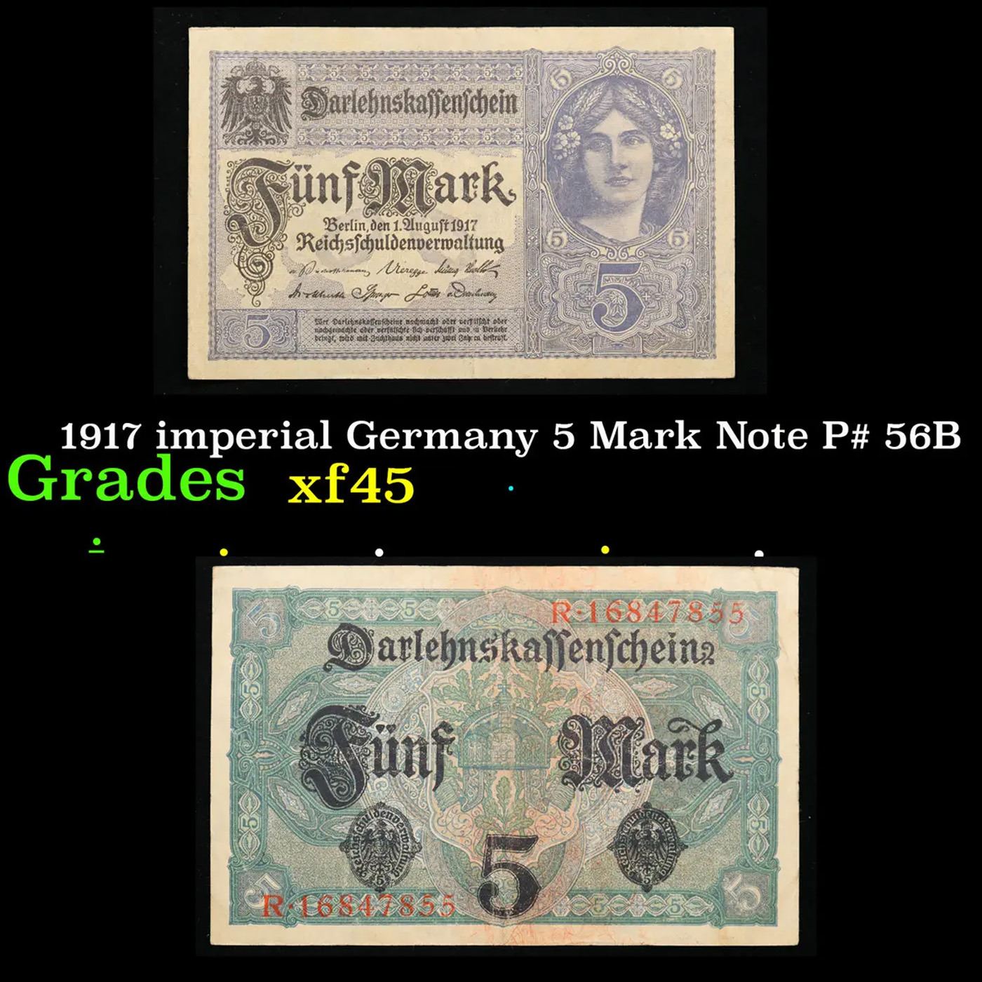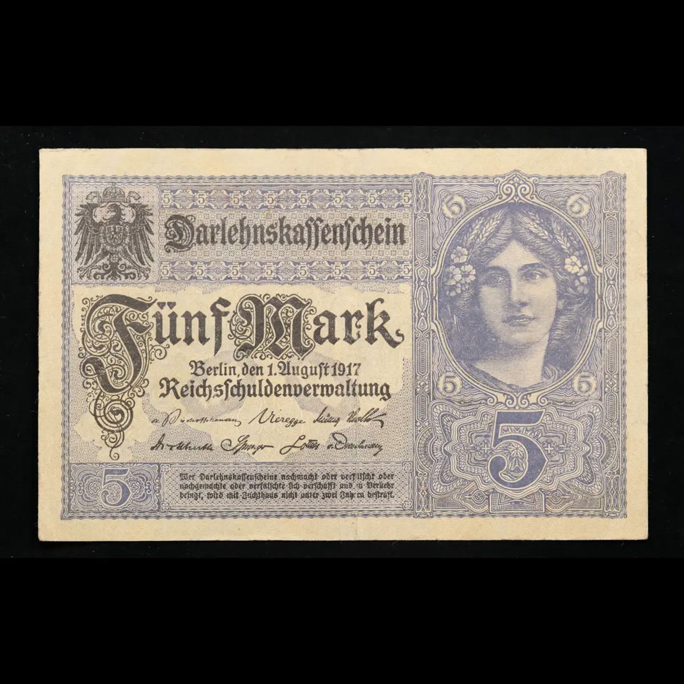 1917 imperial Germany 5 Mark Note P# 56B Grades xf+. In August 1914, Directly after the onset of WW1, the German Empire removed the gold backing of the mark and issued new currency. After the fall of the German Empire in 1918, the newly formed German Weimar Republic issued another new currency, known derisively as the "Paper Mark", which faced massive hyperinflation.