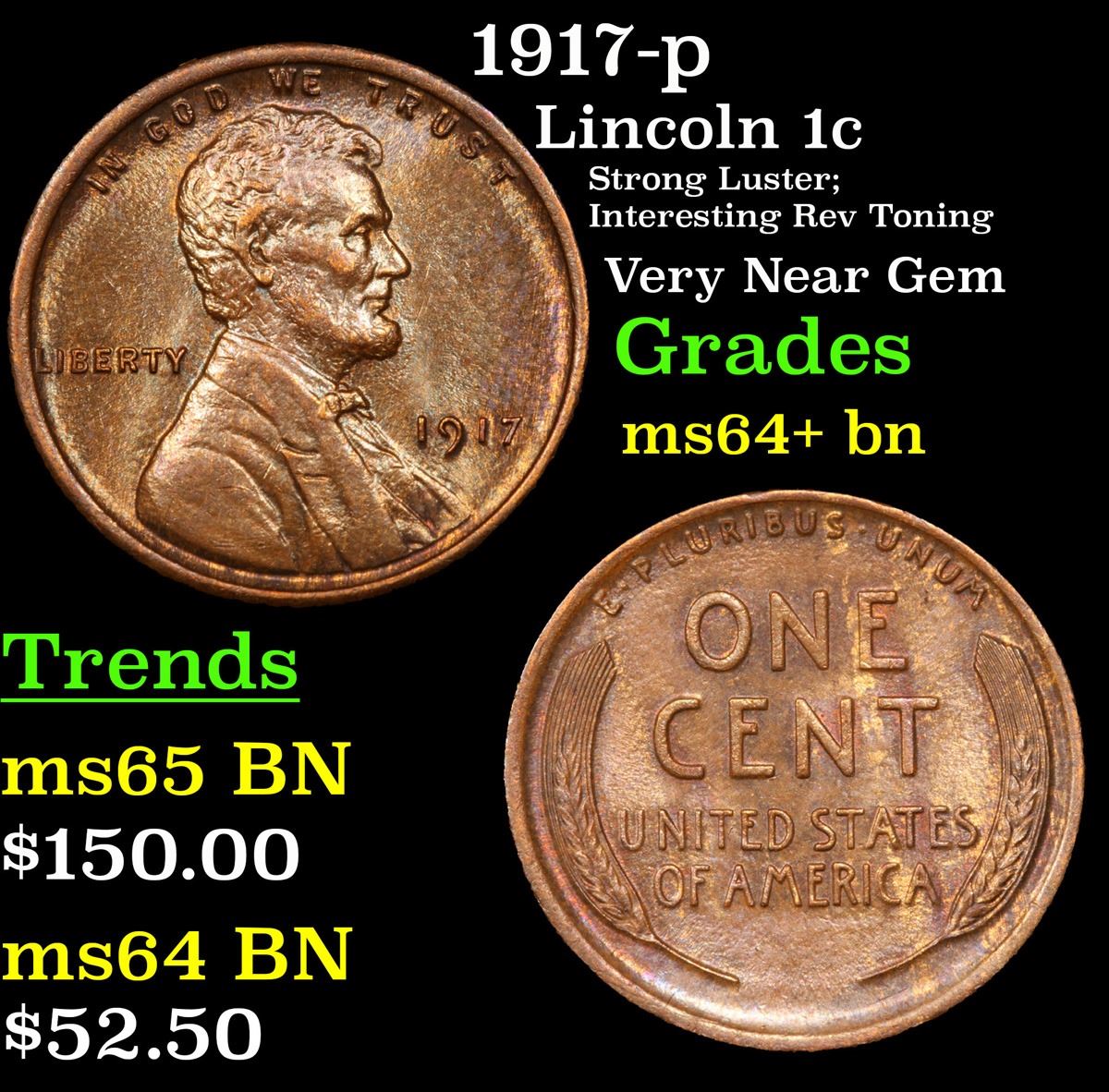 1917-p Strong Luster; Interesting Rev Toning Very Near Gem Lincoln Cent 1c Grades Choice+ Unc BN.