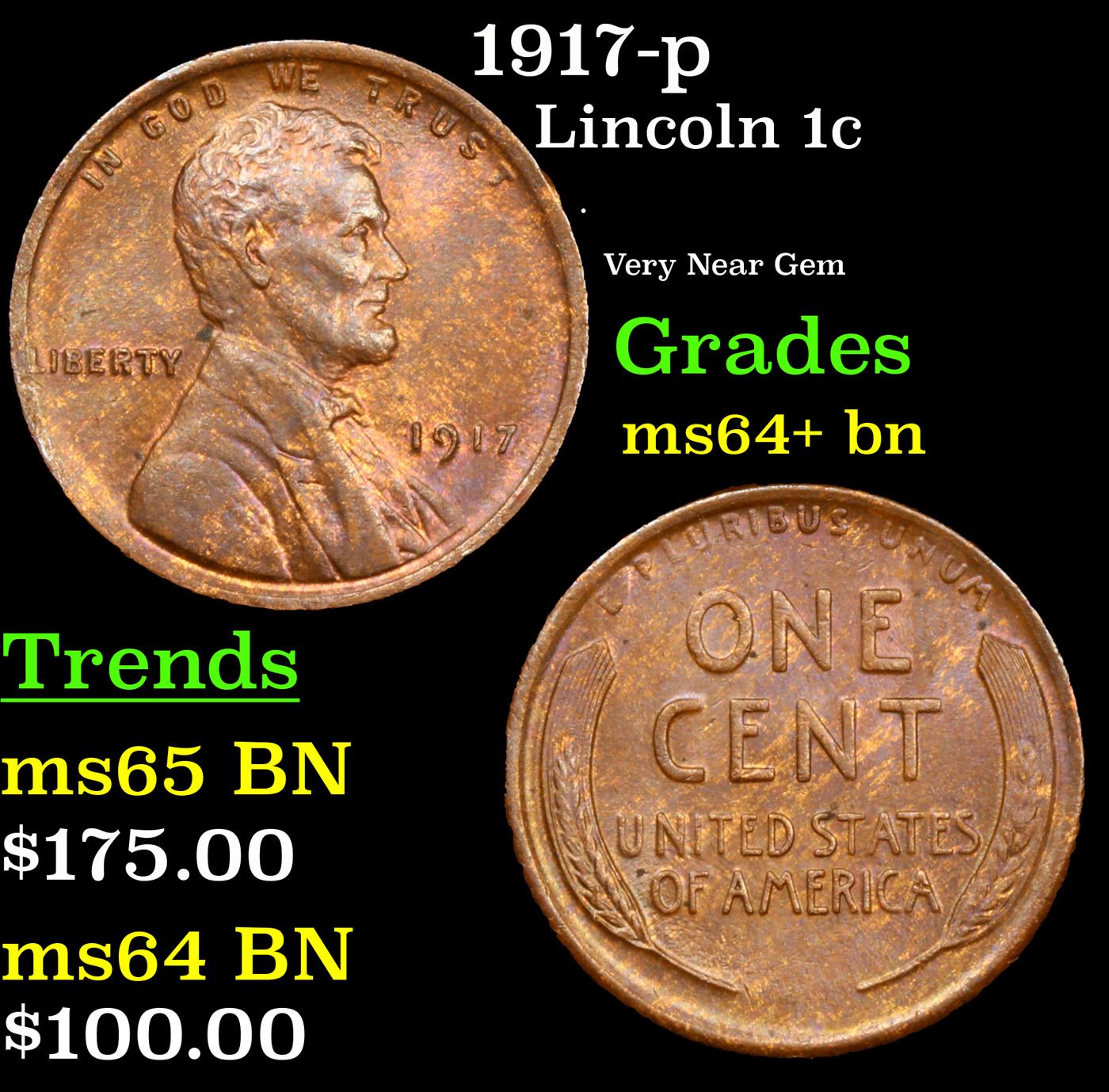 1917-p Lincoln Cent 1c Grades Choice+ Unc BN.