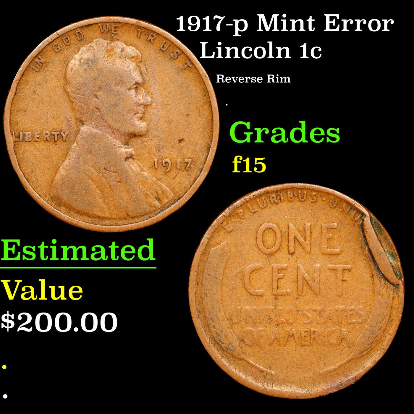 1917-p Mint Error Lincoln Cent 1c Grades f+.