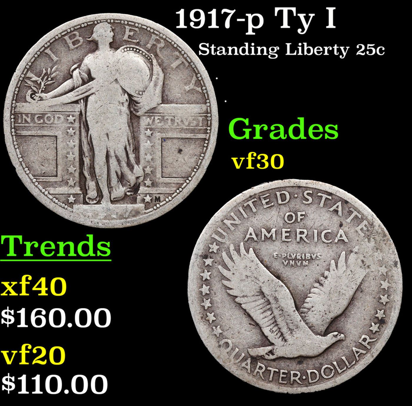 1917-p Ty I Standing Liberty Quarter 25c Grades vf++.