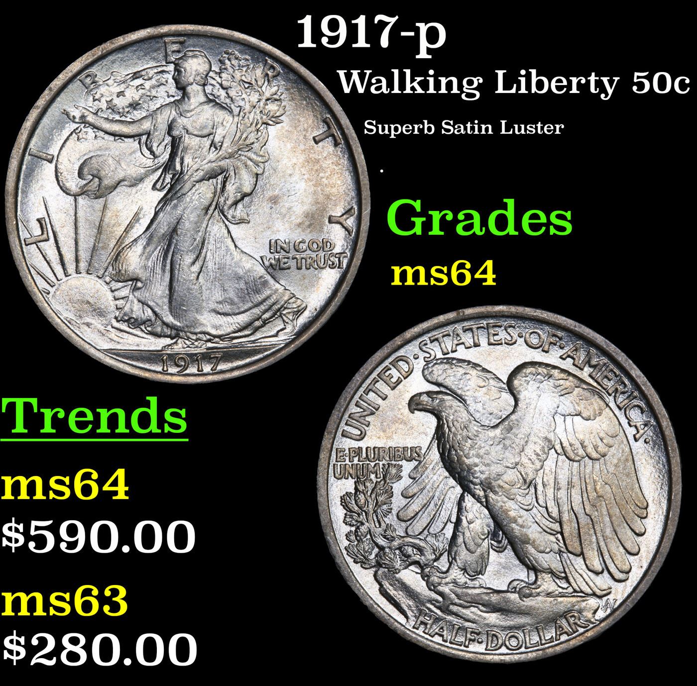 1917-p Walking Liberty Half Dollar 50c Grades Choice Unc.