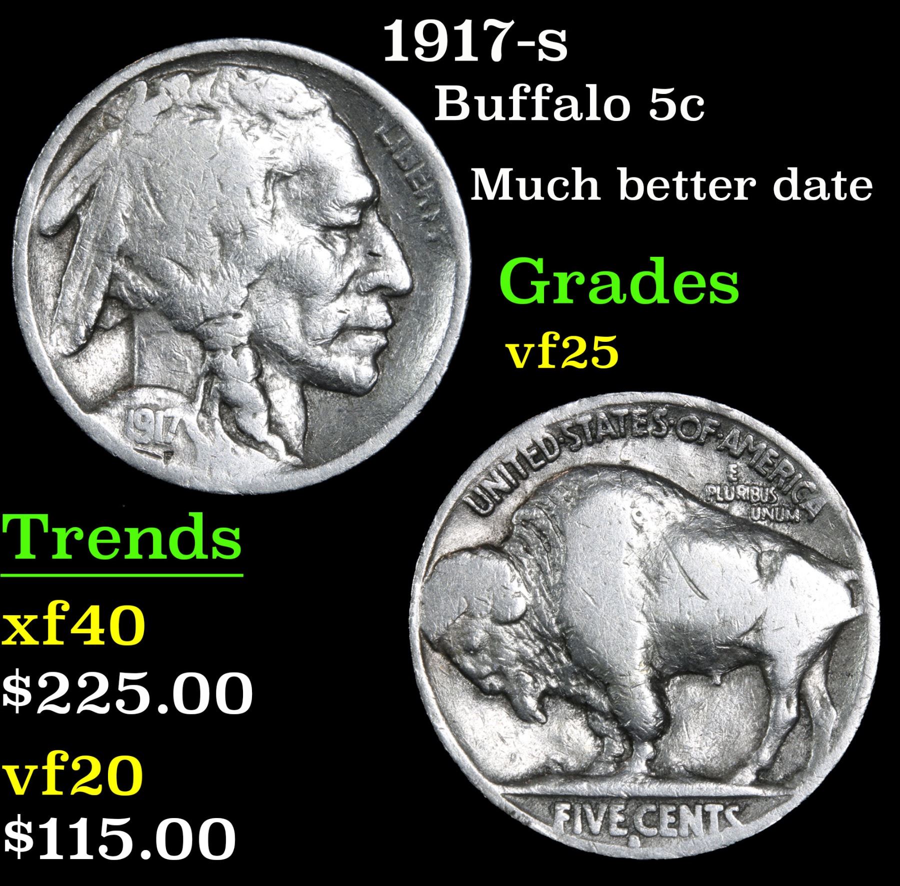 1917-s Buffalo Nickel 5c Grades vf+. Much better date