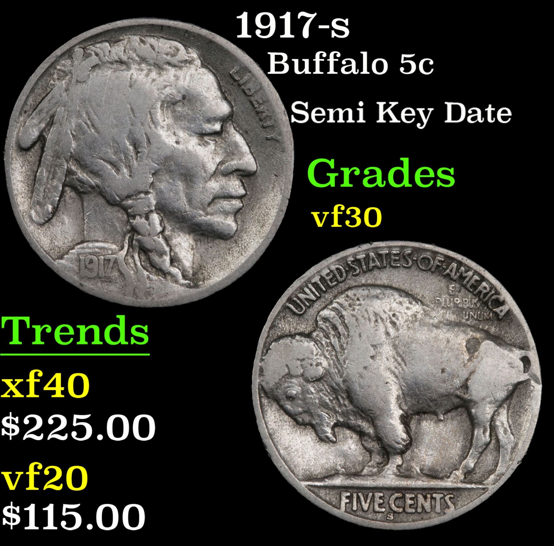 1917-s Semi Key Date . Buffalo Nickel 5c Grades vf++.