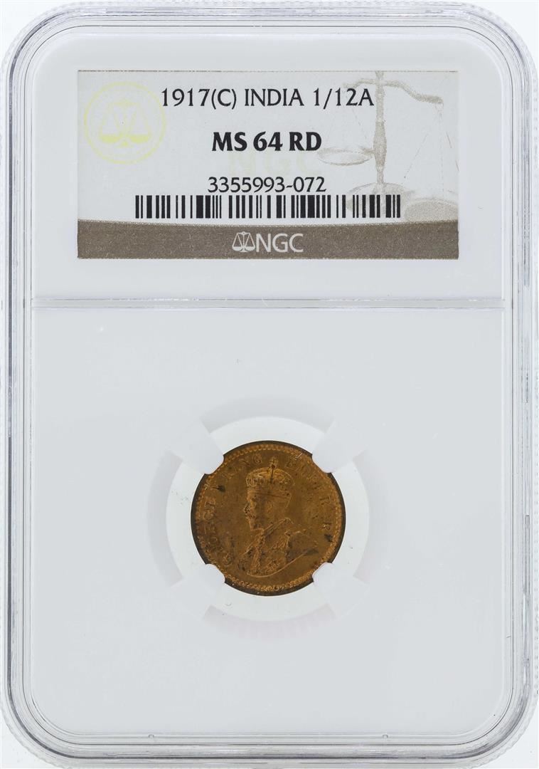 One 1917C India 1/12 Anna Coin NGC MS64RD. NGC Certified.