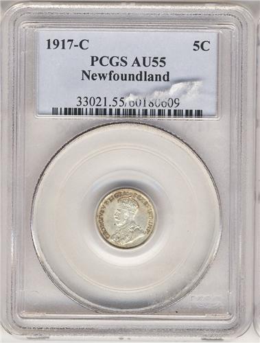 1917c Nfld 5¢. A nice fully struck example and problem free. PCGS AU55