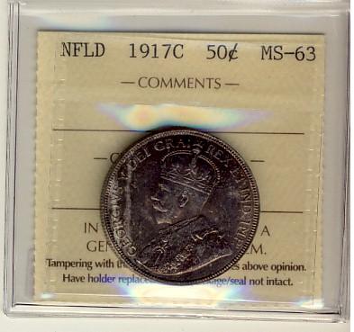 1917c Nfld 50¢ ICCS MS63. Lots of lustre with purple to brown tone.