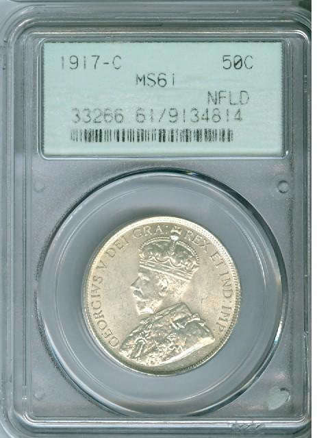 1917c Nfld 50¢ PCGS MS61. Light golden tint with lots of lustre.