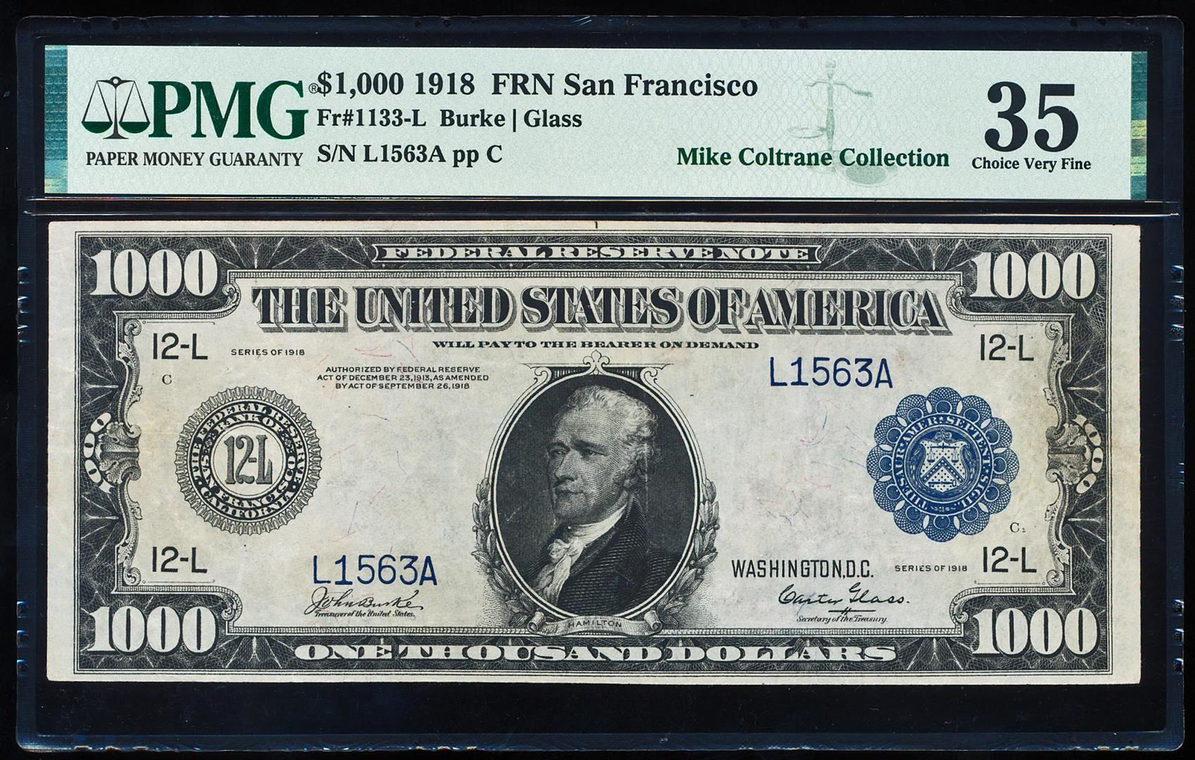 One 1918 $1,000 Federal Reserve Note San Francisco Fr.1133-L PMG Choice Very Fine 35. PMG Certified.