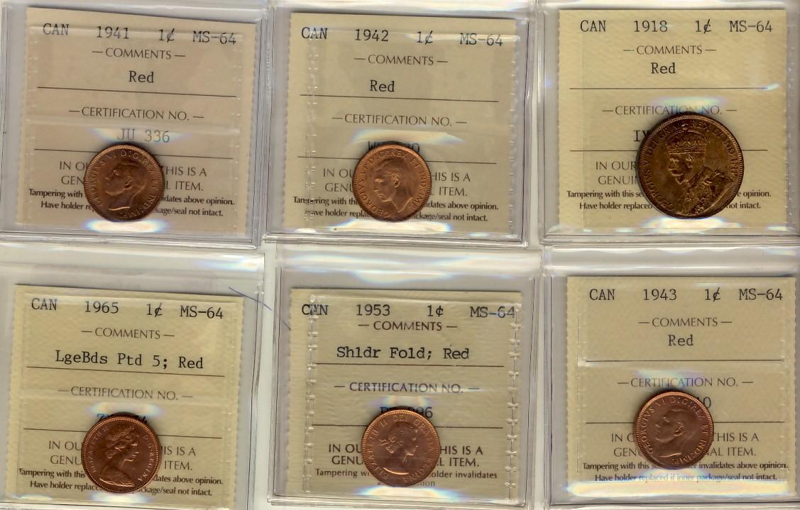 1918 1¢, 1941, 1942, 1943, 1953 SF & 1965 LgBds Ptd 5 ICCS MS64RD. Lot of 6 coins all ICCS graded.