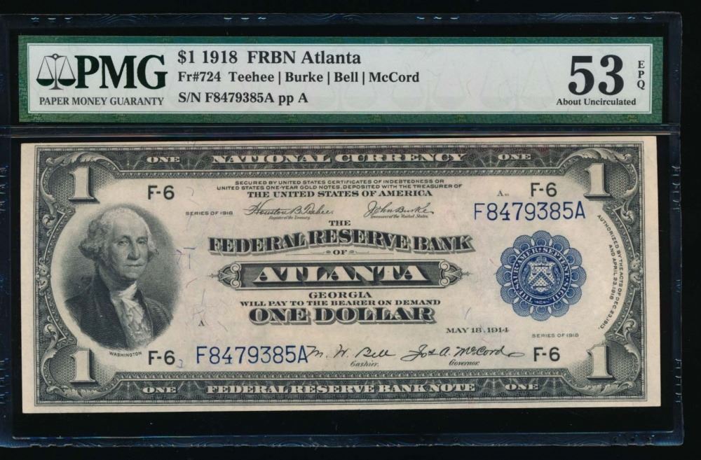 One 1918 $1 Atlanta Federal Reserve Bank Note PMG 53EPQ.