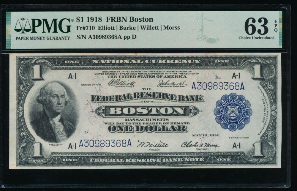 One 1918 $1 Boston FRBN PMG 63EPQ.