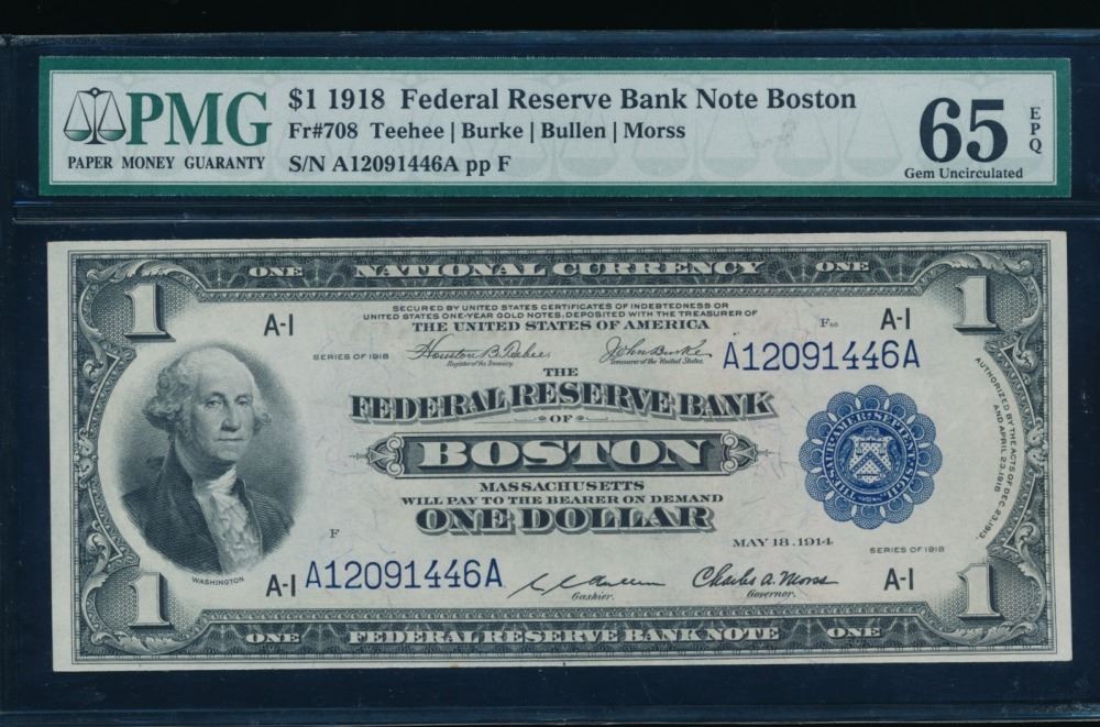 One 1918 $1 Boston FRBN PMG 65EPQ.
