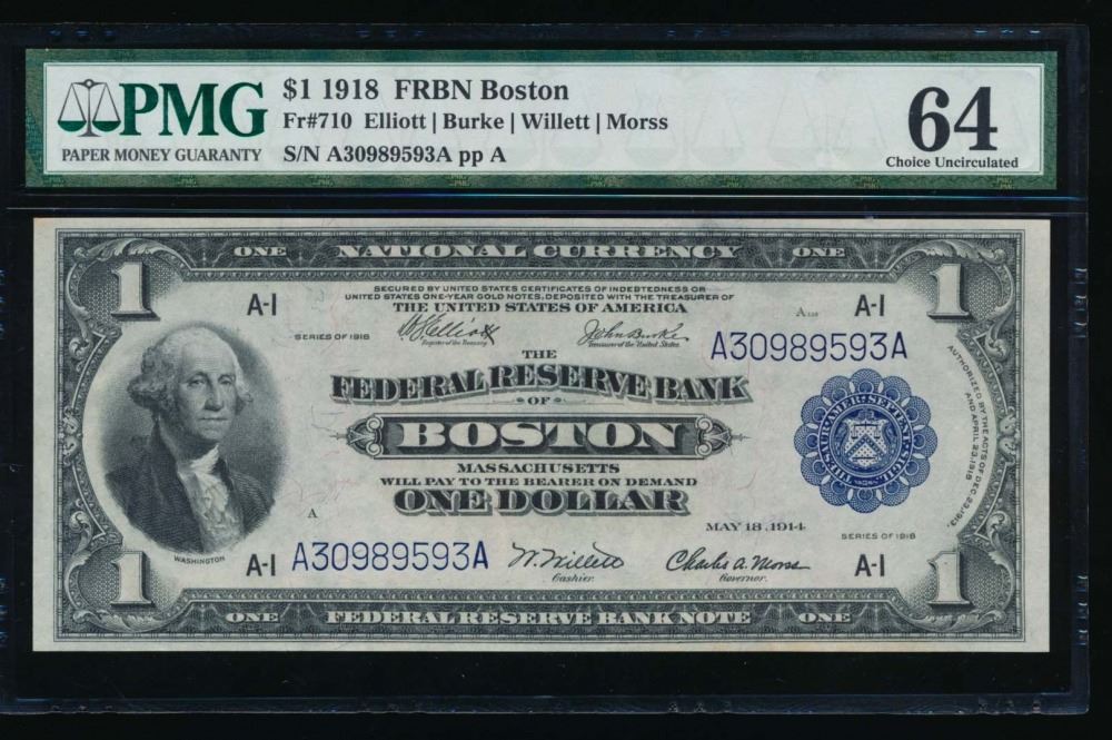 One 1918 $1 Boston Federal Reserve Bank Note PMG 64.