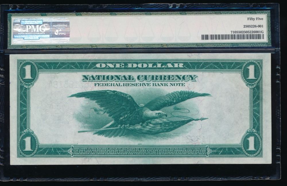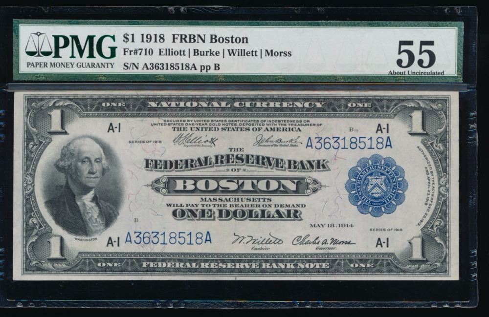 One 1918 $1 Boston Large Federal Reserve Bank Note PMG 55.