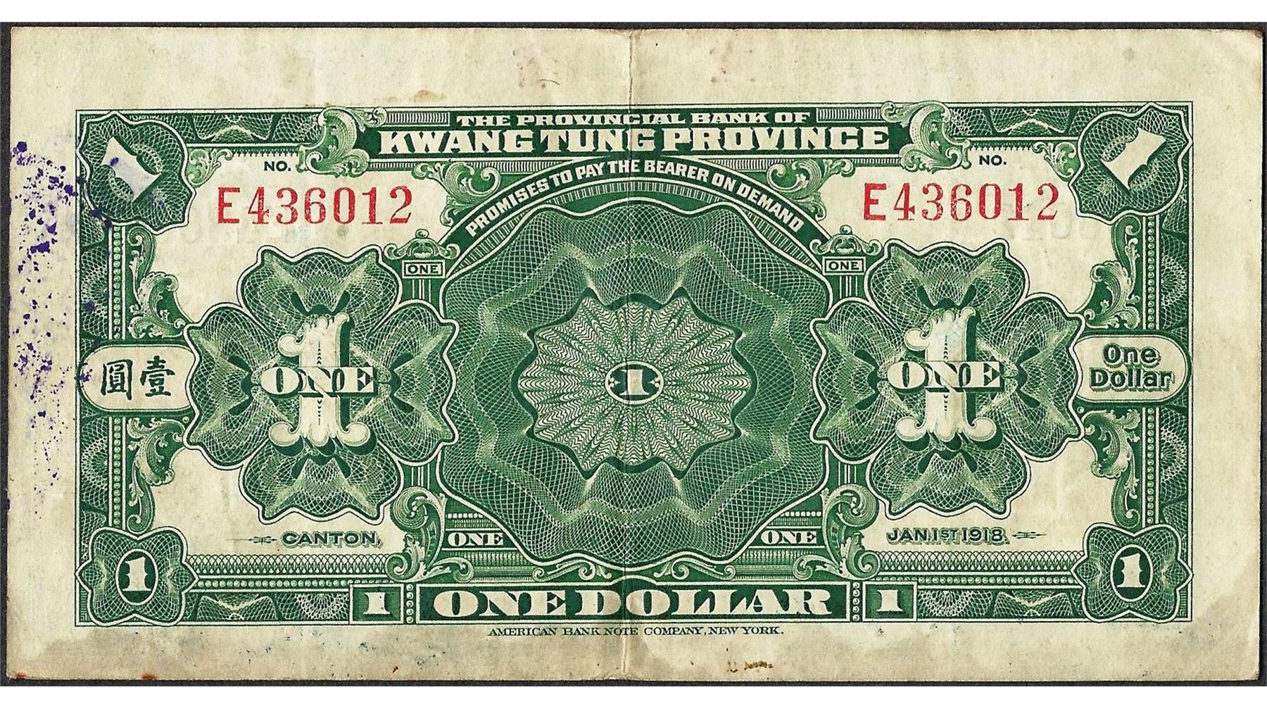 One 1918 $1 Canton Provincial Bank of Kwang Tung Province Currency Note.