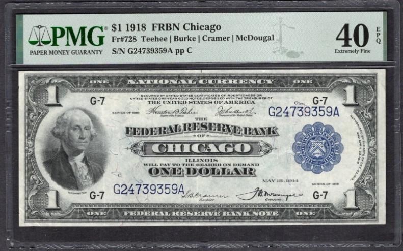 One 1918 $1 Chicago FRBN PMG 40EPQ.