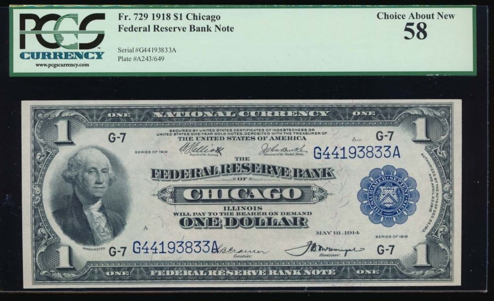 One 1918 $1 Chicago Federal Reserve Bank Note PCGS 58.