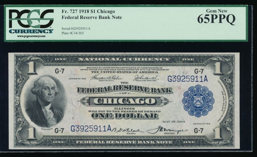 One 1918 $1 Chicago Federal Reserve Bank Note PCGS 65PPQ.