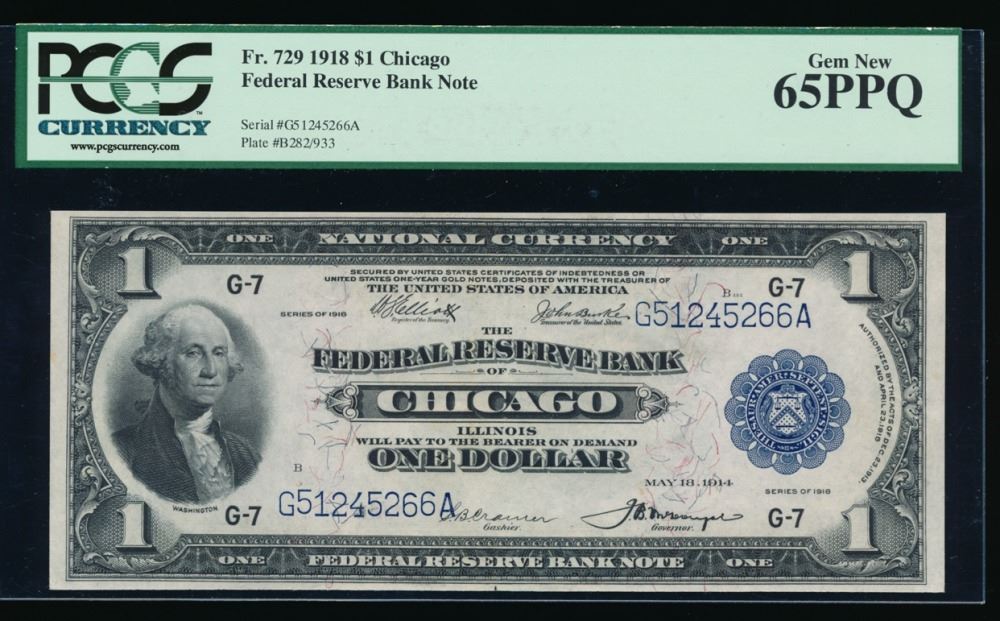 One 1918 $1 Chicago Federal Reserve Bank Note PCGS 65PPQ.