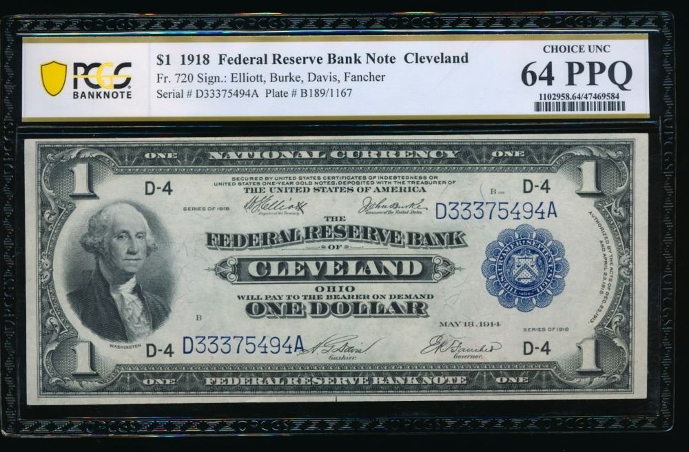 One 1918 $1 Cleveland FRBN PCGS 64PPQ.