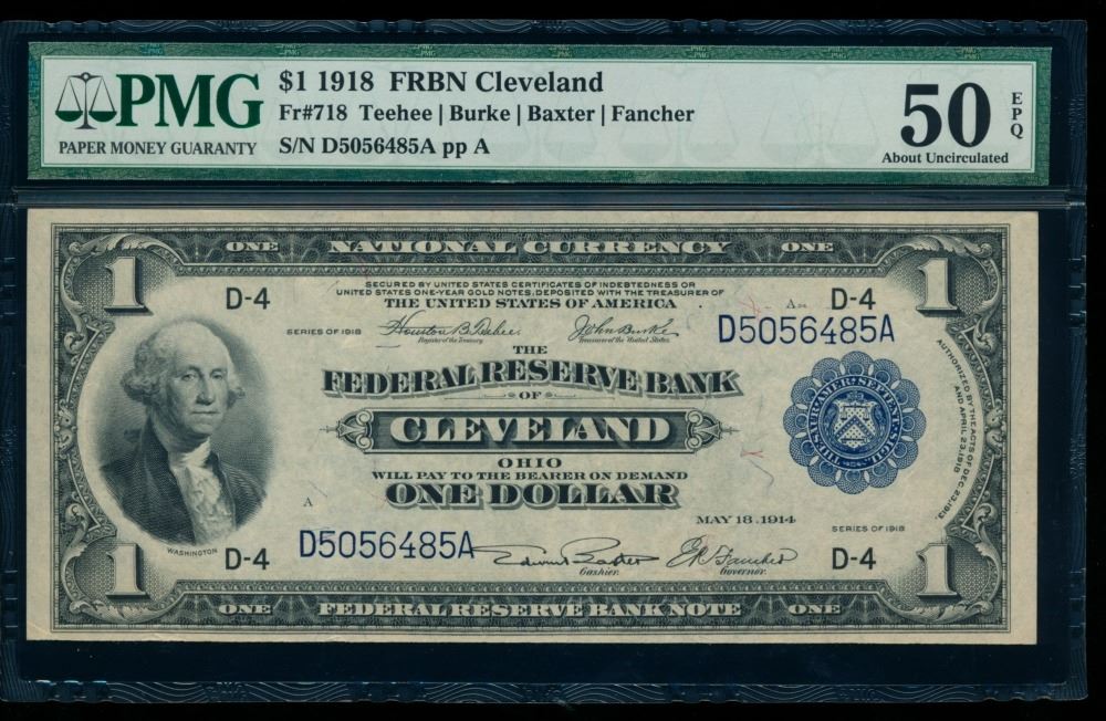 One 1918 $1 Cleveland FRBN PMG 50EPQ.