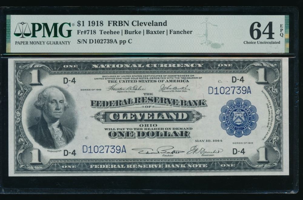 One 1918 $1 Cleveland FRBN PMG 64EPQ.