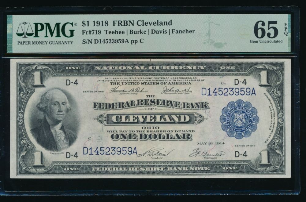 One 1918 $1 Cleveland FRBN PMG 65EPQ.