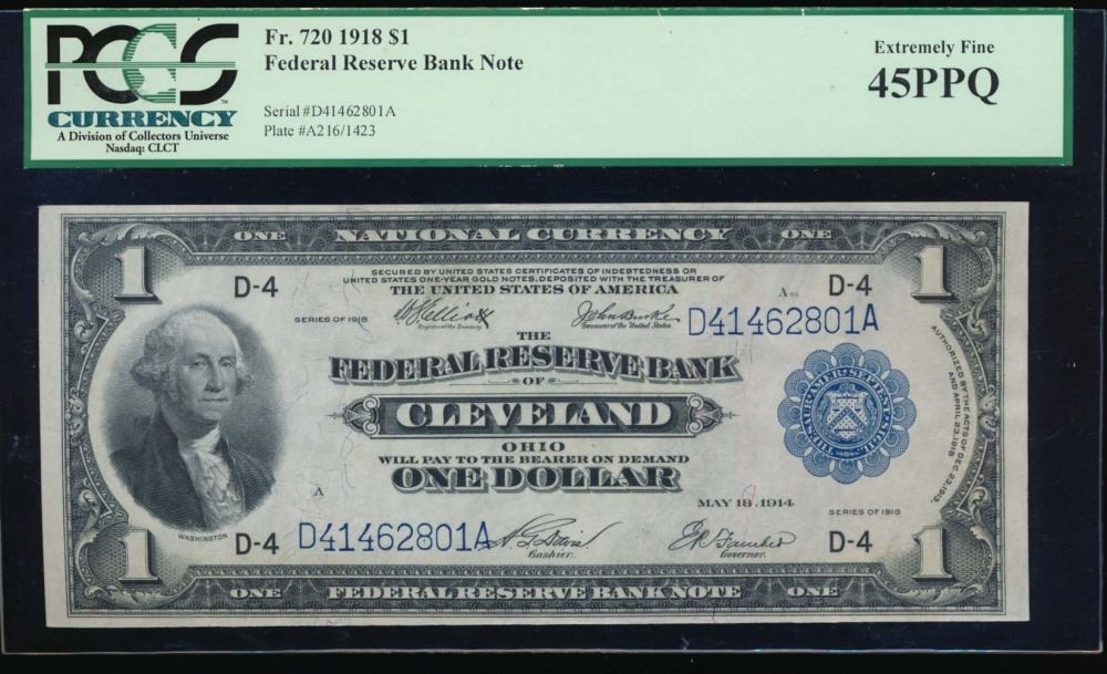 One 1918 $1 Cleveland Federal Reserve Bank Note PCGS 45PPQ.