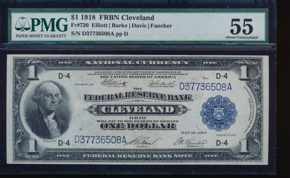 One 1918 $1 Cleveland Federal Reserve Bank Note PMG 55.