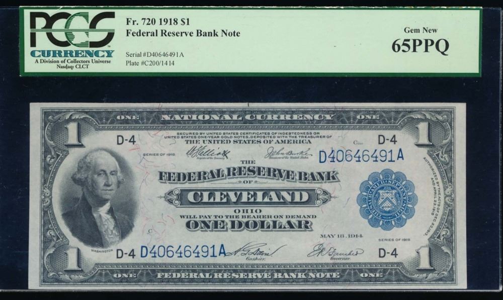 One 1918 $1 Cleveland Federal Reserve Note PCGS 65PPQ.