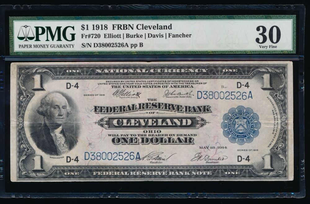 One 1918 $1 Cleveland Large Federal Reserve Bank Note PMG 30.