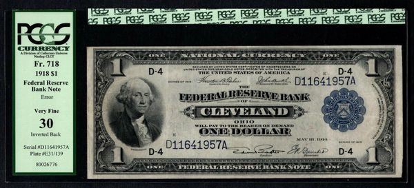 One 1918 $1 ERROR Inverted Back Cleveland FRBN PCGS 30 .