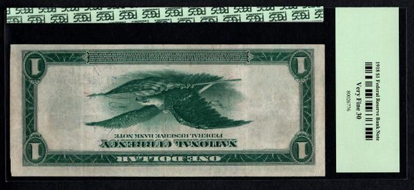 One 1918 $1 ERROR Inverted Back Federal Reserve Bank Note PCGS 30.