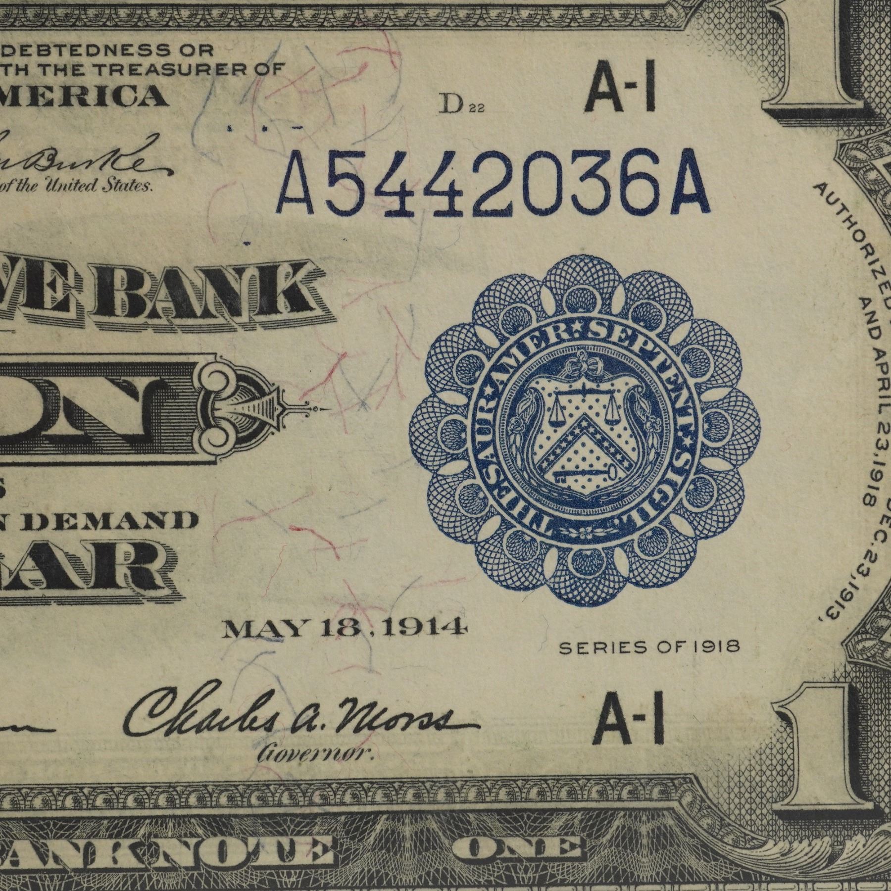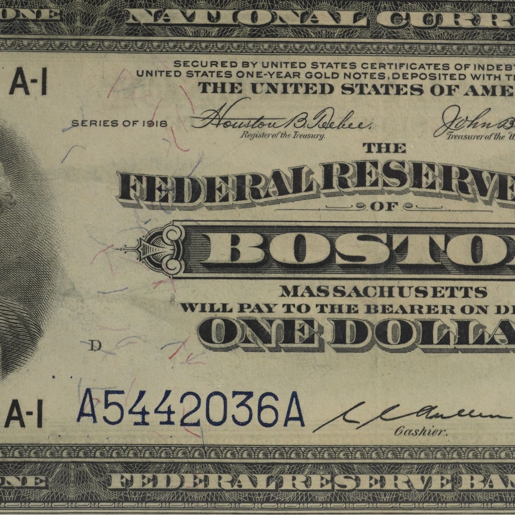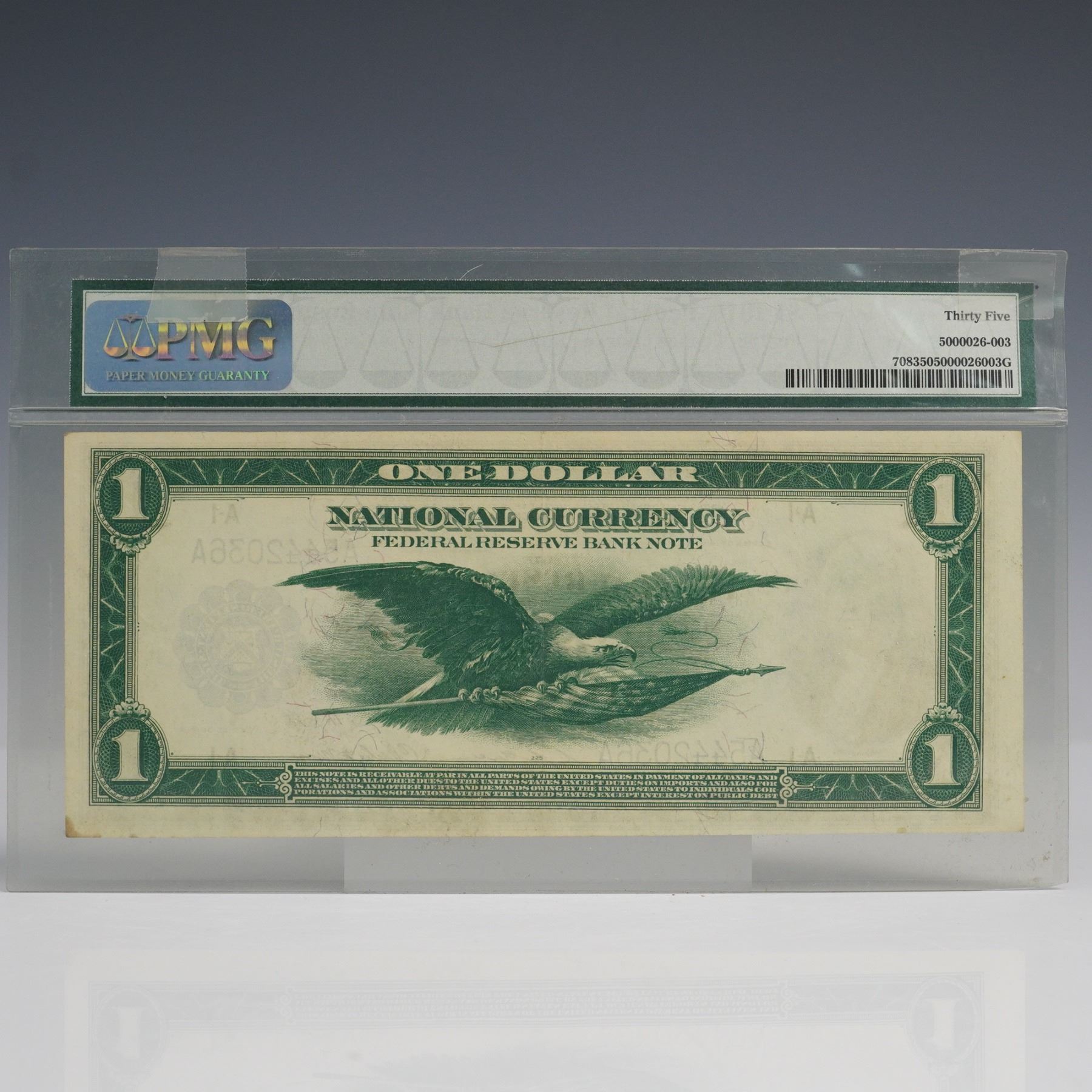 This Series of 1918 $1 large-size Federal Reserve Bank Note, issued by the Federal Reserve Bank of Boston, Massachusetts issued during the initial operational phase of the Federal Reserve System. Graded Choice Very Fine 35 by PMG. This note bears the portrait of George Washington on the obverse, framed by an elaborate border and inscribed with formal declarations of value and security and the Treasury seal appears at right in deep indigo, bearing the Latin motto "Thesaur. Amer. Septent. Sigil." The reverse displays a dynamic engraving of an eagle in flight, clutching arrows and rendered in dark green ink, symbolic of national strength and fiscal vigilance. Printed on the bottom, "THIS NOTE IS RECEIVABLE AT PAR IN ALL PARTS OF THE UNITED STATES IN PAYMENT OF ALL TAXES AND EXCISES AND ALL OTHER DUES TO THE UNITED STATES EXCEPT DUTIES AND IMPORTS AND ALSO FOR ALL SALARIES AND OTHER DEBTS AND DEMANDS OWING BY THE UNITED STATES TO INDIVIDUALS CORPORATIONS AND ASSOCIATIONS WITHIN THE UNITED STATES EXCEPT INTEREST ON PUBLIC DEBT".