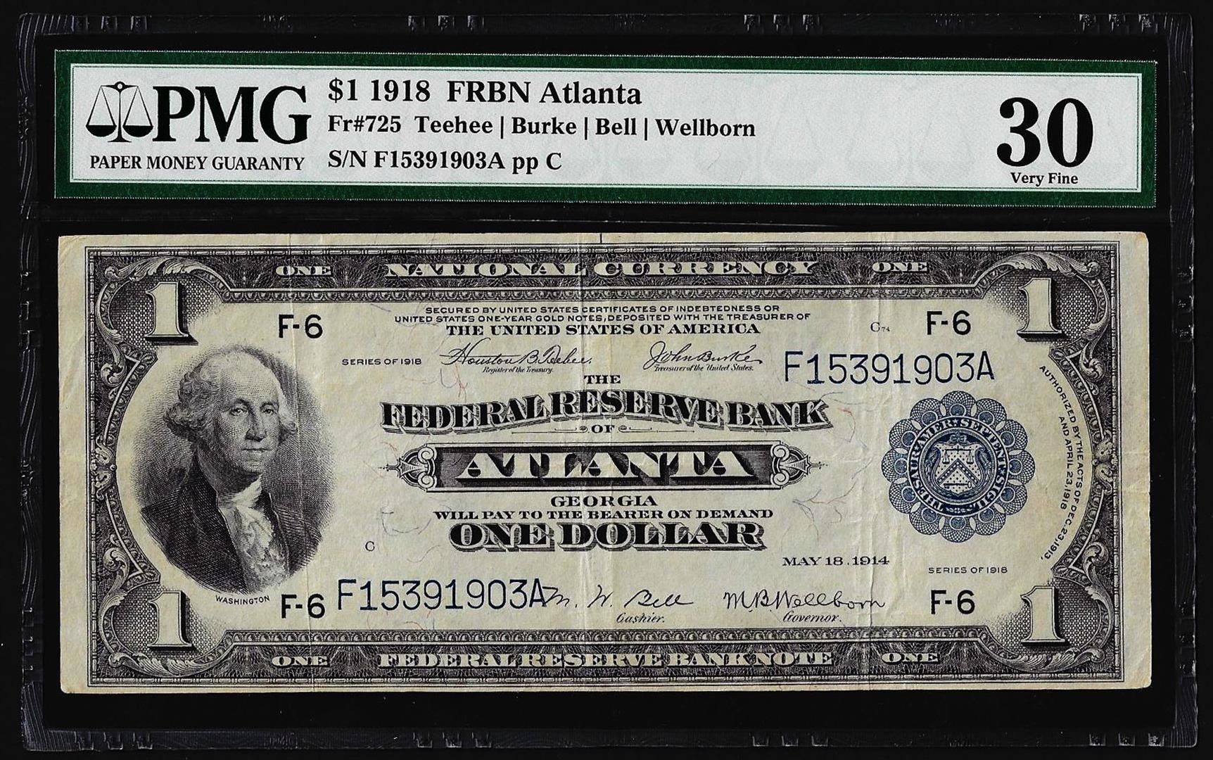 One 1918 $1 Federal Reserve Bank Note Atlanta Fr.725 PMG Very Fine 30. PMG Certified.