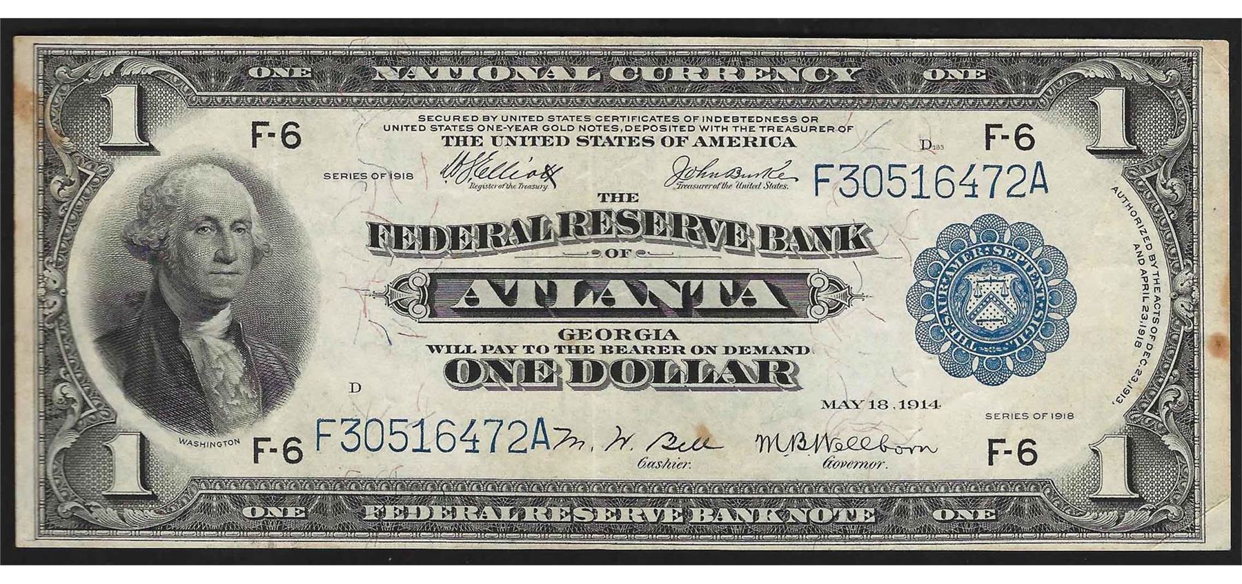 One 1918 $1 Federal Reserve Bank Note Atlanta.