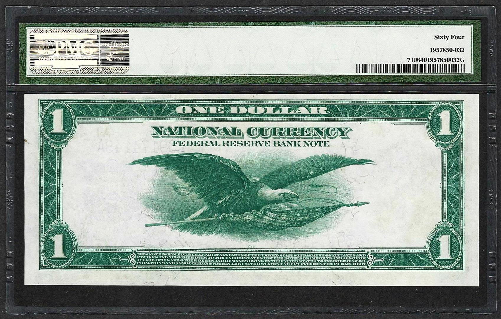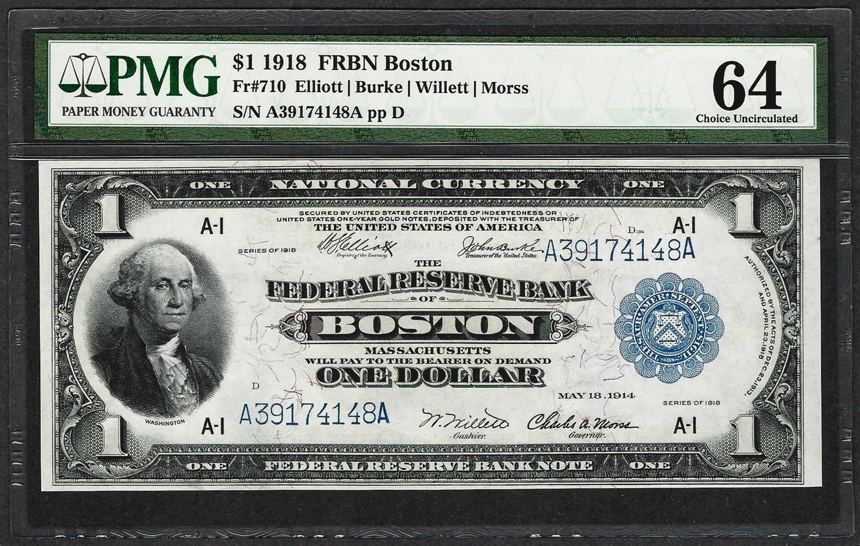 One 1918 $1 Federal Reserve Bank Note Boston Fr.710 PMG Choice Uncirculated 64. PMG Certified.