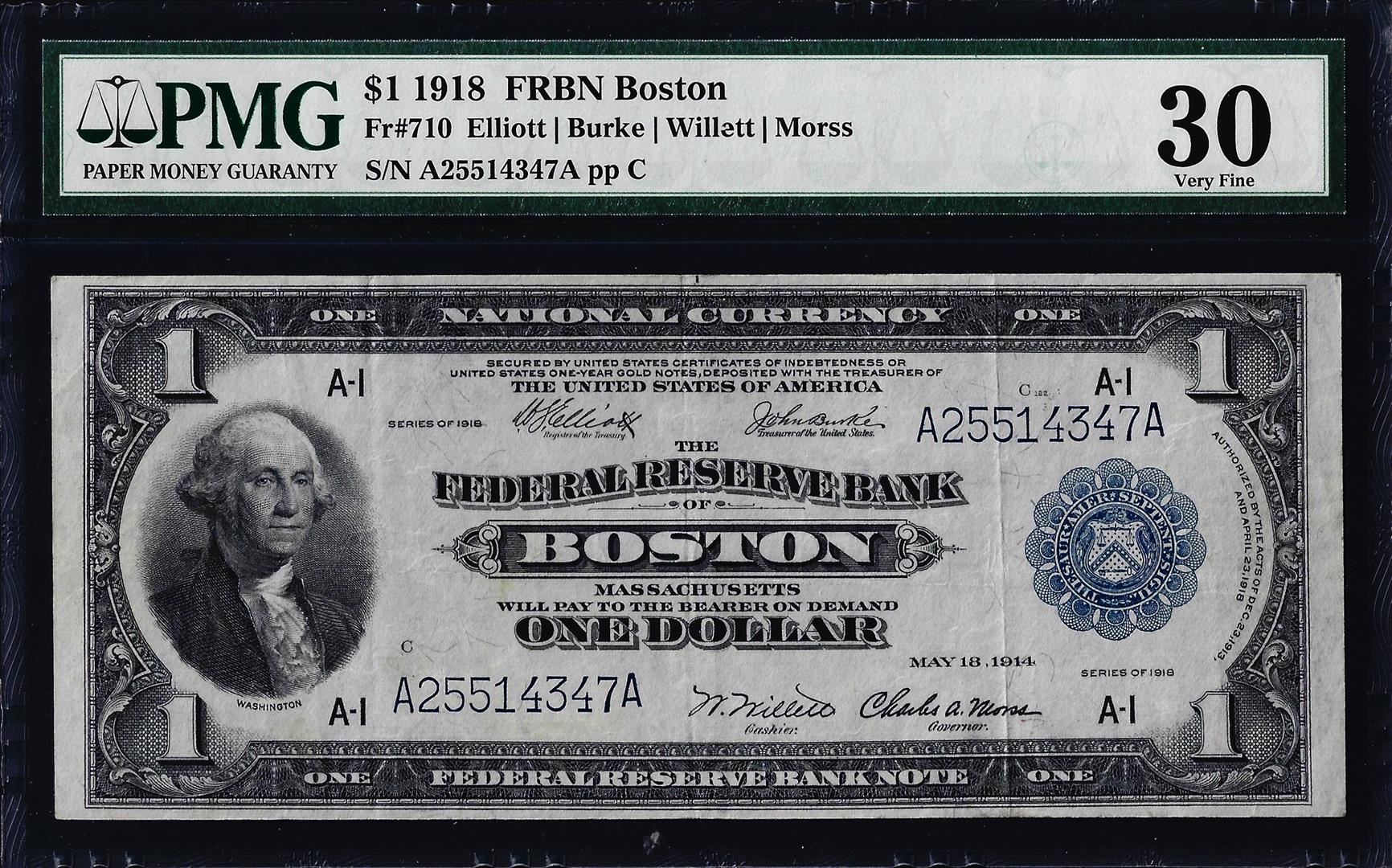 One 1918 $1 Federal Reserve Bank Note Boston Fr.710 PMG Very Fine 30. PMG Certified.