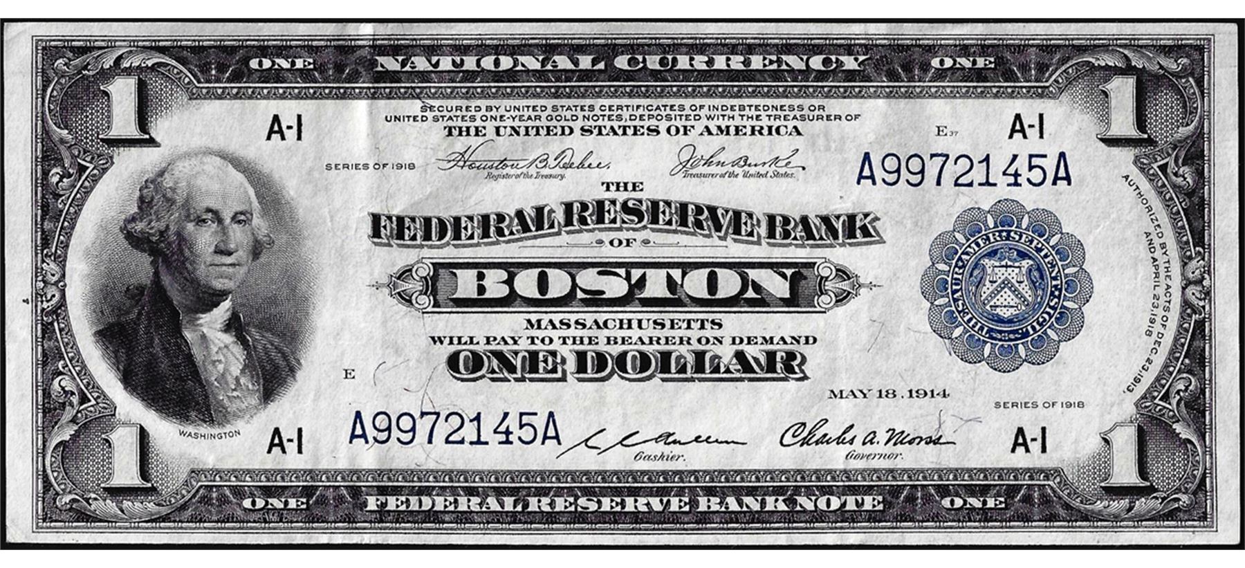 One 1918 $1 Federal Reserve Bank Note Boston.