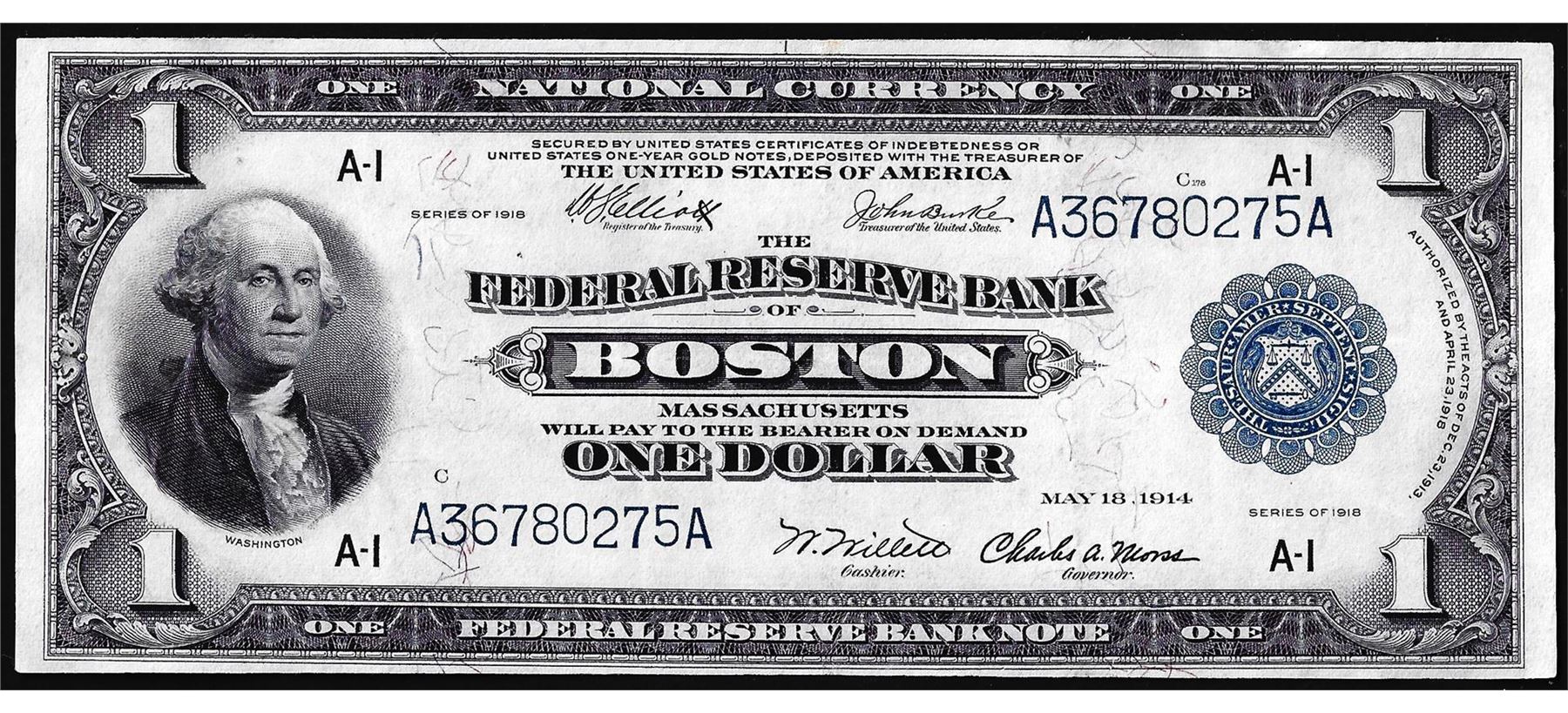 One 1918 $1 Federal Reserve Bank Note Boston.