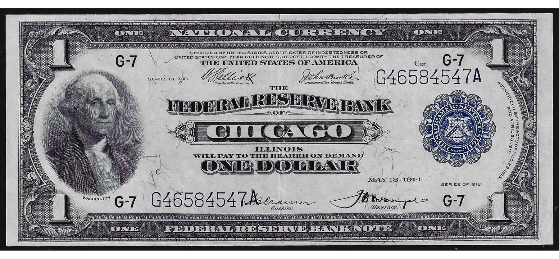 One 1918 $1 Federal Reserve Bank Note Chicago.