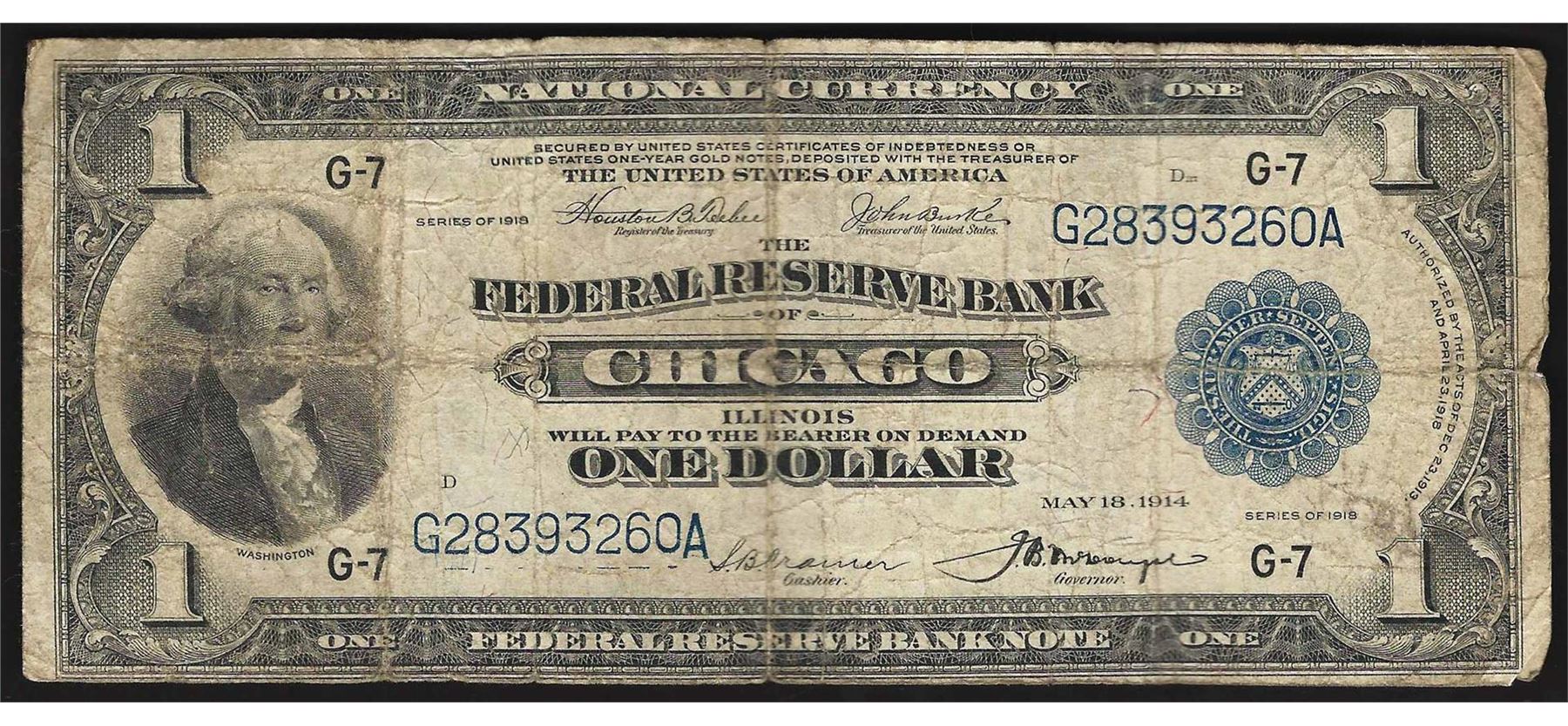 One 1918 $1 Federal Reserve Bank Note Chicago.