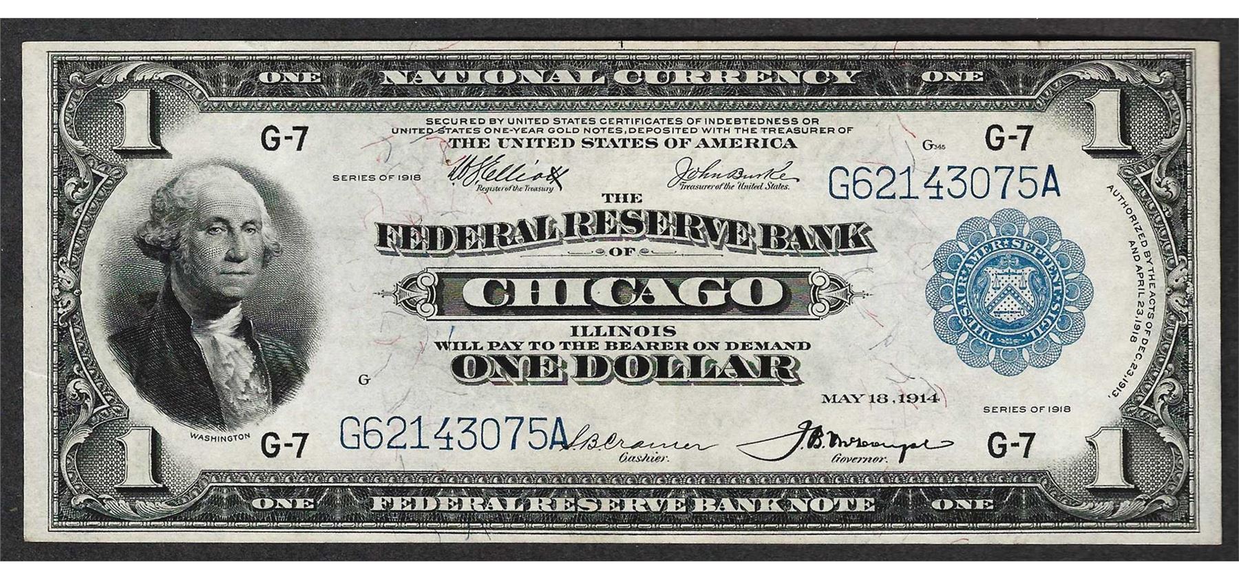 One 1918 $1 Federal Reserve Bank Note Chicago.
