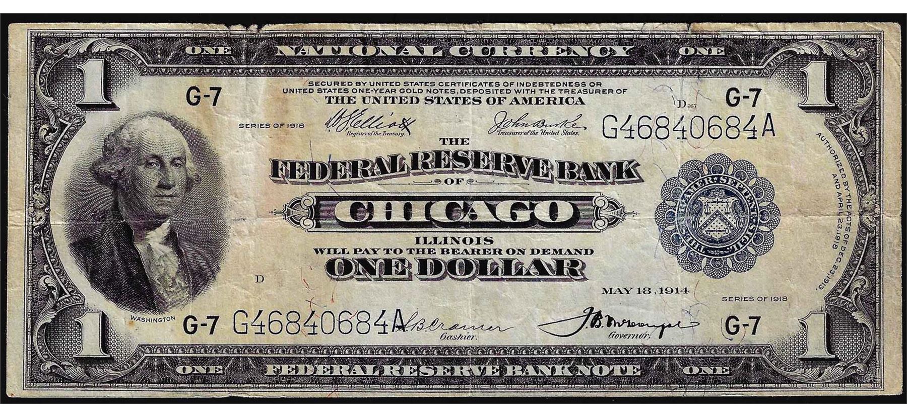 One 1918 $1 Federal Reserve Bank Note Chicago.