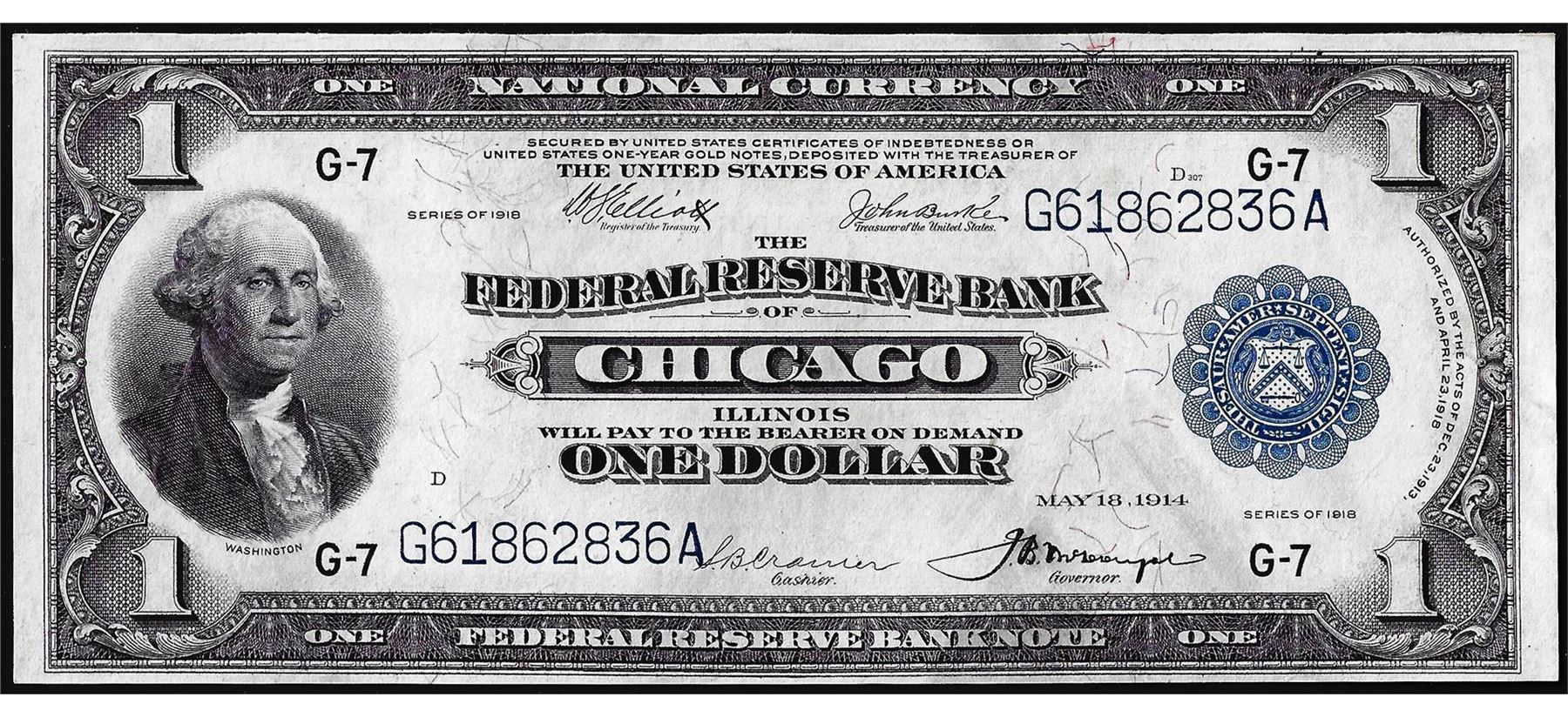 One 1918 $1 Federal Reserve Bank Note Chicago.