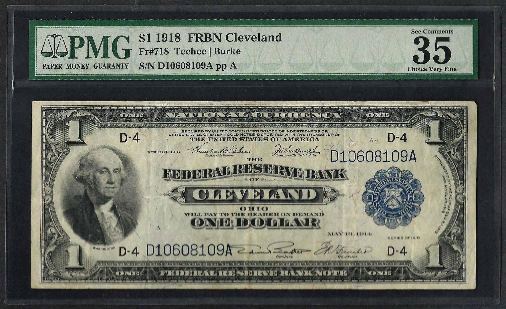 One 1918 $1 Federal Reserve Bank Note Cleveland Fr.718 PMG Very Fine 35EPQ. PMG Certified.