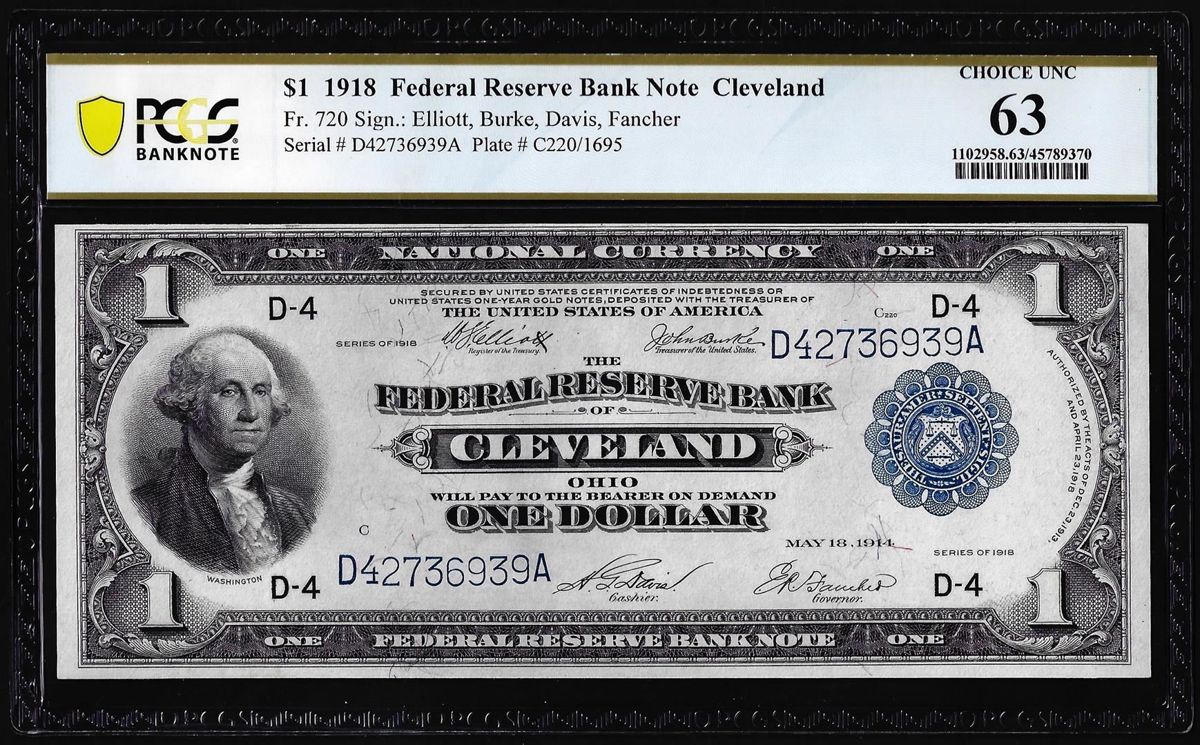 One 1918 $1 Federal Reserve Bank Note Cleveland Fr.720 PCGS Choice Uncirculated 63. PCGS Graded.